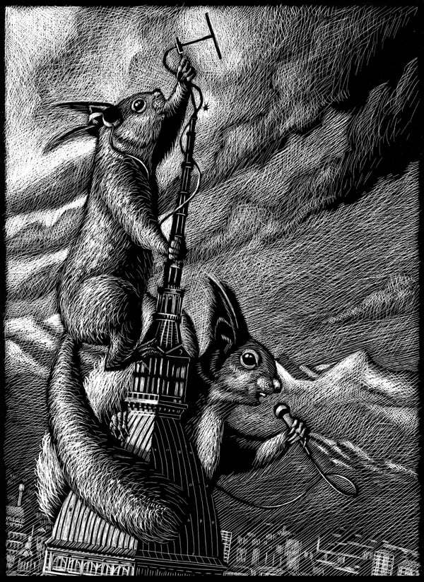 We asked Rocco to work on our visual identity primarly because of the style and subjects of his artwork. Forests and trees that emerge by scratching the light away from black paper, animals that fight capitalism, all sort of organics - wild and lived entities contaminate his drawings and we wanted that world to contaminate our software as well.